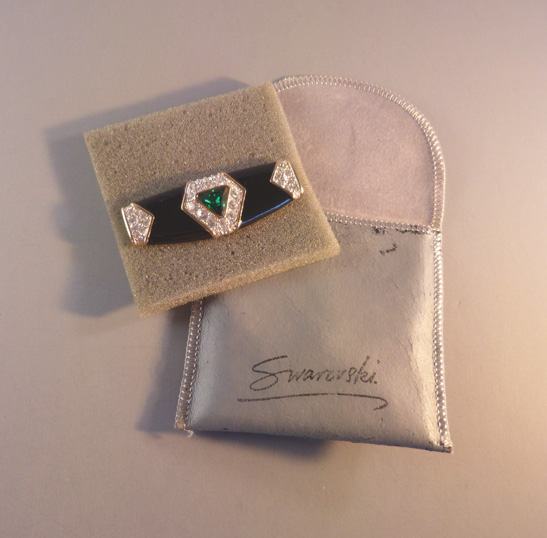 SWAROVSKI Savvy sparkling gift package brooch with a large and brilliant round clear rhinestone center, green enameled edge and red enameled bows in a hand polished gold plated setting with the swan logo on the back, 1-1/4″ wide. We have a lot of information about Swarovski on our Swarovski reference page and more on our … Continue reading “SWAROVSKI Savvy brilliant gift package brooch with a large round clear rhinestone center, green enameled edge and red enameled bows”