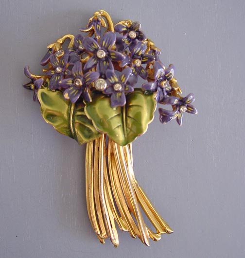 BIRD in flight enameled bird brooch with sparkling clear rhinestone pave, 3-1/2″ by 3-1/4″. The enameling on this is a lovely metallic bronze, caramel and yellow on a silver tone setting. This is a period copy of the Boucher bird brooch that came out in the early 1940s. View View #Y42486 $138.00