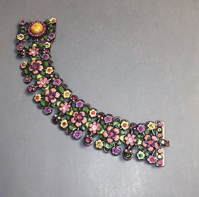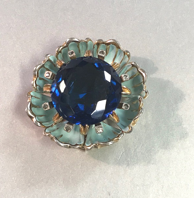 TRIFARI necklace and bracelet with red enameled and gold tone cupped flower petals, green leaves and red glass beads in gold tone settings. This set is not signed, but it was purchased by a well-known dealer from a DeRosa niece. It isn’t a typical DeRosa, and I have now seen a fur clip to this … Continue reading “TRIFARI necklace and bracelet with red enameled flowers, green leaves and red glass beads”