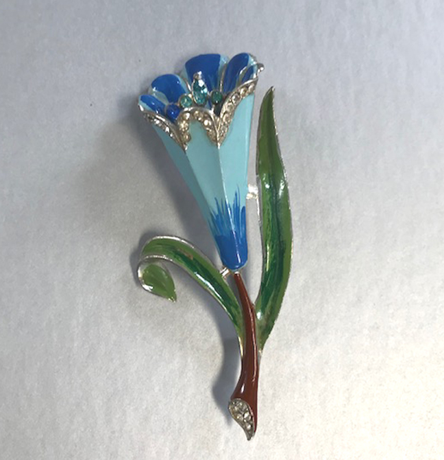 BASKET brooch with colorfully enameled flowers and clear rhinestones set in white or pot metal, made in the 1930s, 2-1/8″ by 2″. Baskets are always a favorite motif for brooches and this one is in wonderful condition with lovely enameled details in the design. View View #Y41962 $238.00