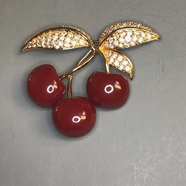 MAZER attributed red and green enameled cherry fur clip of rhodium plated base metal and clear rhinestones, 2-1/4″ by 1-3/4″, not signed. It does have the number “14” on the back of one cherry. The colors on this are rich and dramatic and it almost looks good enough to eat! It is from the early … Continue reading “MAZER attributed red and green enameled cherry fur clip, 1942”