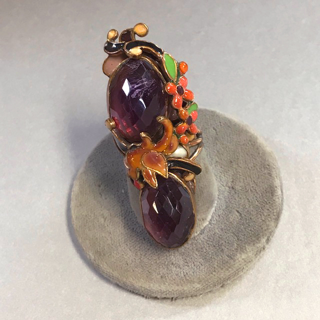 FLOWER bouquet brooch with red rhinestones, glass pearls and green enameled leaves in a gold tone sterling silver setting. It is 2-1/2″ by 1-1/3″ and was made in the 1940s. This is a design I hadn’t ever seen before and I really like it, do you? The colors are so cheerful. View View View View … Continue reading “FLOWER bouquet brooch with red rhinestones, glass pearls and green enameled leaves, sterling”