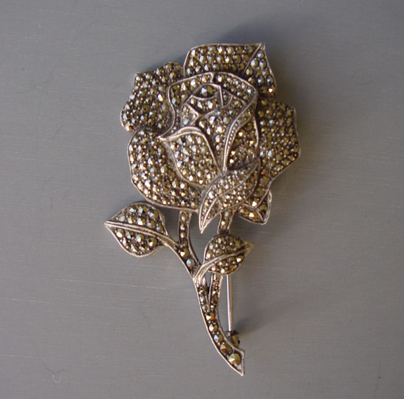 ROSE marcasites rose brooch in silver tone setting, marked “silver” on the back, 2-1/2″ by 1-1/4″. View #Q37288 $130.00
