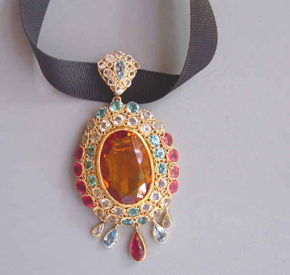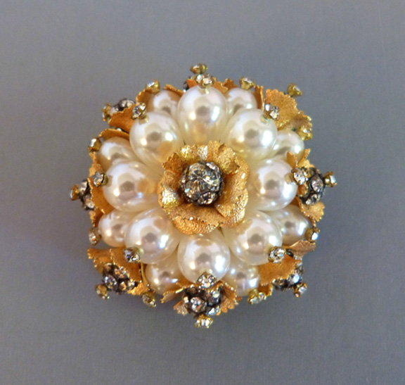 AMOURELLE large flower brooch in honey and topaz-colored rhinestones and rose montee surrounding a dazzling art glass cabochon center. This is a nice large3″ pin on a gold tone filigree base, marked “Amourelle” in a heart on the back. Amourelle was Frank Hess’s company, under the Kramer umbrella, started after he left his job as head designer … Continue reading “AMOURELLE large flower brooch in honey and cabochons, 1960s”