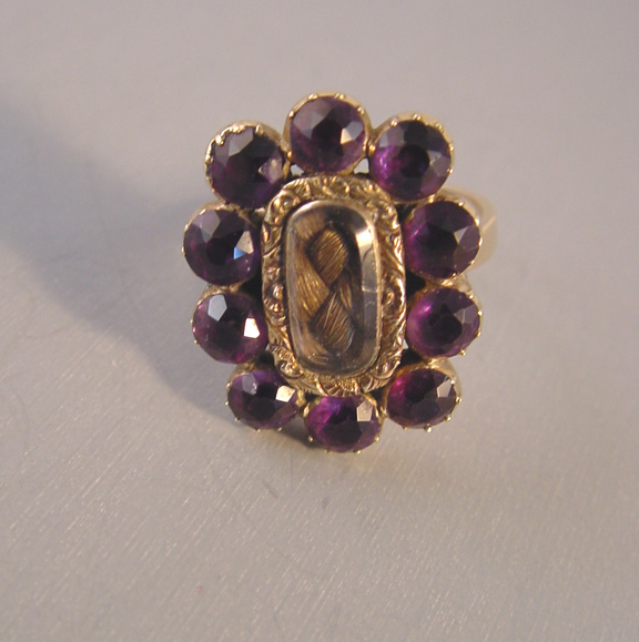 VICTORIAN or late Georgian 10 karat gold hair ring with amethysts surrounding the center covered center that holds the hair, such a beauty! It has a replaced band, professionally done, and is marked inside “10” and maker’s mark “VJ” in a diamond shape, and it is a size 9. According to a 1993 Canadian appraisal, the … Continue reading “VICTORIAN /Georgian 10 karat gold hair ring with amethysts”