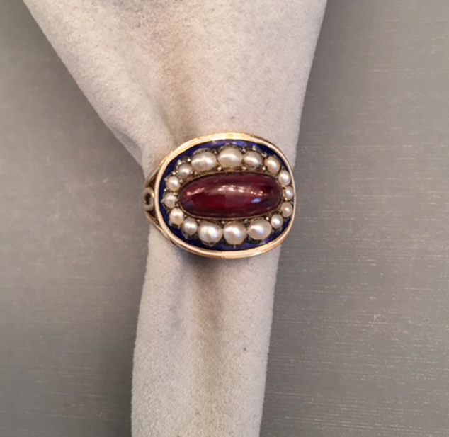 GEORGIAN 15k ring with a wine red garnet cabochon surrounded by a halo of seed pearls in graduated sizes and an outer ring of midnight blue enamel. Circa 1800-1820, it is a size 6-1/4 and lays 1/2″ along the finger. The gem stone “garnet” was named after the fruit “pomegranate” for the color and luminescence of the … Continue reading “GEORGIAN 15k ring with a wine red garnet cabochon”