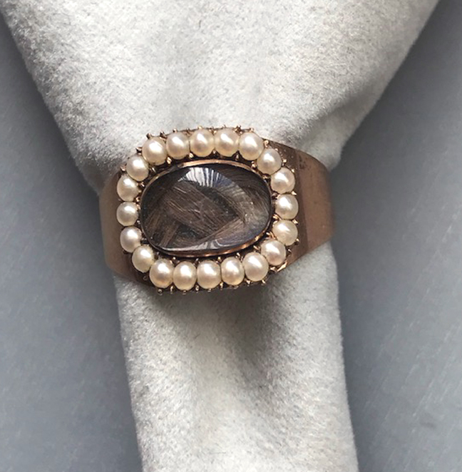 GEORGIAN antique memorial or mourning hair ring, an antique 1802-dated 9 karat yellow gold, seed pearl and hair mourning ring inscribed inside “En Thornton obt 8 Nov 1802 at 54”. The size is 8-3/4 and it is 1/2″ along the finger at the front. The total weight is about .13 ounces. There are 20 pearls … Continue reading “GEORGIAN antique 9k, pearl and hair mourning ring 1802 and inscribed En Thorton”