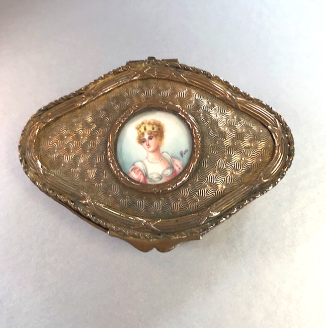 PORTRAIT BOX eye shaped golden ormolu style jewelry or dresser box with a hand painted lady in pink on the top and embossed scrolls on all sides, 3-1/2″ by 2-1/2″. The portrait is of Napoleon’s wife, Josephine, and is hand painted. The antiqued gold tone finish is in excellent vintage condition with the only wear … Continue reading “PORTRAIT BOX antique jewelry box with Josephine hand painted portrait”