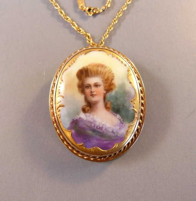 VICTORIAN 10-14 karat yellow gold and hand painted portrait brooch with a flip-up loop for a necklace chain. It is hand painted with gold trim, marked “DIBB 10k” on the back bottom, 2-1/8″ by 1-5/8″. It is marked 14k on the catch and 10k on the frame, chain tests 10k but the catch doesn’t. I … Continue reading “VICTORIAN 10-14 karat yellow gold and hand painted portrait brooch with a pop-up loop for a necklace chain”