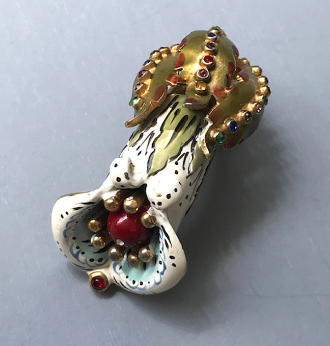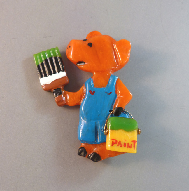 SHULTZ bakelite painter pig figural brooch in peach with painted blue overalls and a laminated green tipped brush with painted black accents, 3″ by 2-1/3″. The bucket is free-swinging. This little piggy wants to come home with you! Like all Shultz, the bakelite used to create his peices is from the 1930-40s, and all pieces hand … Continue reading “SHULTZ bakelite painter pig figural brooch”