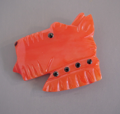 SHULTZ bakelite sunrise red-orange swirl dog head brooch, a big one at 3-1/4″ by 2-5/8″. The black eyes are applied black bakelite accents and the nose is painted on. The carving i shand done. The color we call ”sunrise” is swirl of orange through red which is very subtle. A similar piece can be seen in the book, … Continue reading “SHULTZ bakelite sunrise dog head brooch”