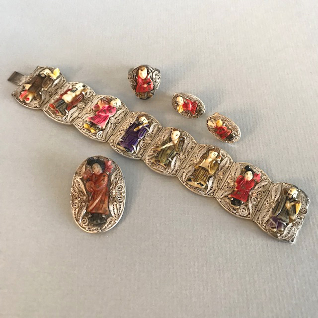 CHINA silver filigree parure with the 8 Immortals motif. The figures are hand carved and painted bone and they each hold a symbol of their profession. The bracelet is 6-5/8″ by 1-1/4″, the pin is 1-1/2″ by 1″, the ring is adjustable and size 7 with a length along the finger of 3/4″ and the … Continue reading “CHINA silver filigree parure with the Eight Immortals motif”