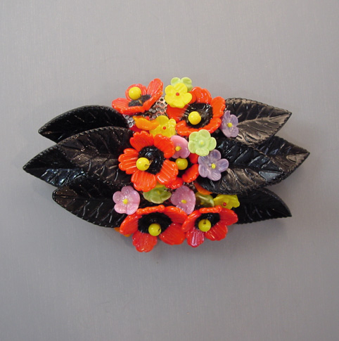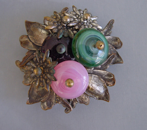 MIRIAM HASKELL dress clip with pink, green, purple flattened glass beads with antiqued silver tone leaves and flowers, circa 1940, 2″. An unsigned Frank Hess design for Miriam Haskell circa 1940. It is in excellent condition. View #H34480 $158.00