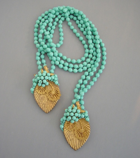 MIRIAM HASKELL aqua glass beads and gold tone metal leaves lariat necklace that is really beautifully designed. It is 27″ total length with a 2-1/2″ dress clip on each end. A Frank Hess design for Miriam Haskell, this is unsigned as was typical for this era, circa 1940. This is in excellent condition, both the beads and the gold … Continue reading “MIRIAM HASKELL aqua glass beads, gold leaves lariat”
