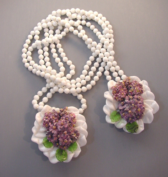 MIRIAM HASKELL Hess very rare white lariat necklace with lovely purple glass hydrangea flowers and green leaves. The dress clip ends are made of white glass beads and leaves, green transparent leaves, and purple painted glass flower centers, total length 27″, each clip is 2-1/2″. A Frank Hess design for Miriam Haskell, it is unsigned … Continue reading “MIRIAM HASKELL Hess rare lariat necklace purple glass hydrangea flowers”