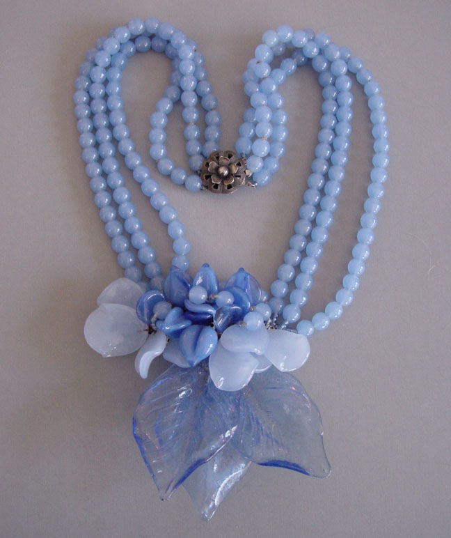 HASKELL Hess lush blue glass leaves, flowers and beads necklace, circa 1930’s, 16-1/2″ by 3-1/3″. This has blue glass beads and leaves set off by dimensional, cobalt blue floral beads and lighter blue glass petals. A Frank Hess design for Miriam Haskell, these are not signed as was typical for this era, circa 1940.The pieces … Continue reading “HASKELL Hess lush blue glass leaves, flowers and beads necklace”