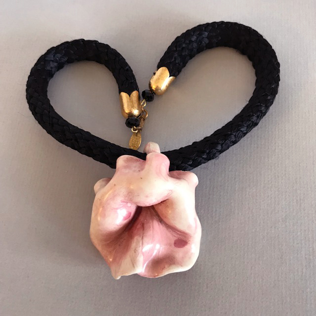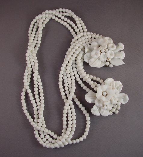 MIRIAM HASKELL by Hess white molded glass flowers, leaves and beads lariat necklace. It is 24″ in total length with 2-1/4″ wide dress clips on each end. A Frank Hess design for Miriam Haskell, it is unsigned as was typical for this era, circa 1930-40s. What amazing things Hess designed for Haskell back then, and … Continue reading “MIRIAM HASKELL Hess white glass flowers, leaves lariat necklace”
