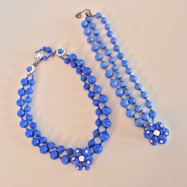 MIRIAM HASKELL by designer Bob Clarke medium blue 2-strand necklace and 3-strand bracelet, both with white glass bead accents. The necklace 15-1/4″ and the bracelet is 7″, and it has it’s safety chain. Each bead is lamp blown and hand made, so special. The beads in the necklace are a tad bit darker than the ones … Continue reading “MIRIAM HASKELL by Bob Clarke medium blue necklace and bracelet”