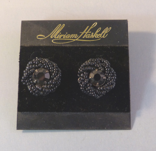 HASKELL black beads earrings with a faceted bead center in each, 1″ clip backs made in 2001 by Miriam Haskell and I purchased them at the Haskell headquarters when we were in New York City. #H19547 $24.00