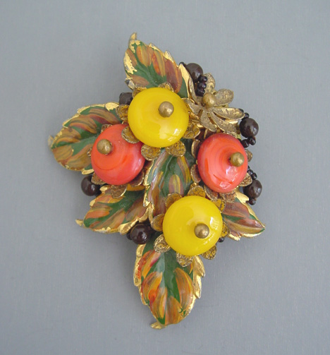 HASKELL Hess flattened orange and yellow glass beads and painted leaves clip, 3-1/4″. A Frank Hess for Miriam Haskell, it is unsigned as was typical for this era, circa 1935. The painted leaves on this piece were used in the Fall of 1935 according to Larry Vrba. A similar piece can be seen in Christie Romero’s … Continue reading “HASKELL Hess glass beads & painted leaves clip 1935”