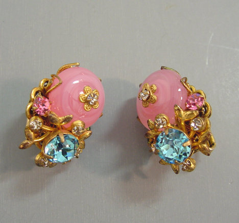 MIRIAM HASKELL pink glass bead earrings with blue rhinestones set in gold tone. They are marked on the back “Miriam Haskell” and are 1″ clip backs. These are so gorgeous and a fine example of the work from this maker, in excellent vintage condition, circa 1960. View #H39110 $115.00