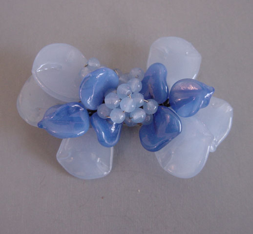 HASKELL Hess blue glass flowers and leaves brooch, circa 1930’s, 2-1/3″ wide. A Frank Hess design for Miriam Haskell, these are not signed as was typical for this era, circa 1940. These glass petals are just so lovely in person, and this is a part of one of Haskell’s best sets in my opinion! The pieces by Miriam Haskell in … Continue reading “HASKELL Hess blue glass flowers and leaves brooch, circa 1930’s”