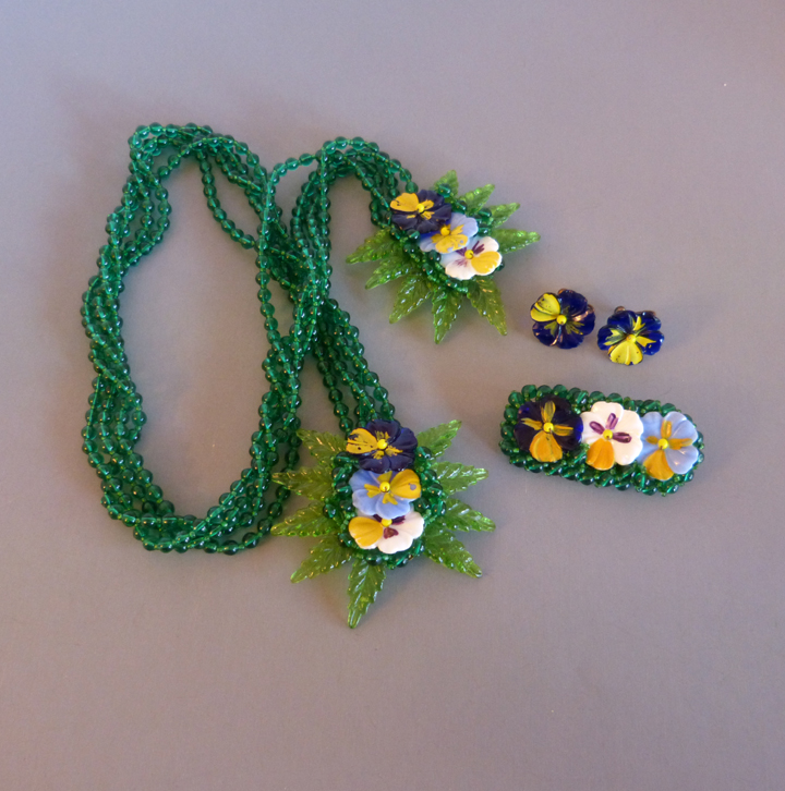 HASKELL Hess brooch with pink and yellow violet-like flowers and green molded glass leaves on a pierced WWII era plastic backing, 3″ by 3″. A Frank Hess design for Miriam Haskell, it is unsigned as was typical for this era circa 1940. It looks like a bouquet picked straight from the garden! The pieces by Miriam Haskell in the … Continue reading “HASKELL Hess brooch with pink and yellow violet-like flowers”
