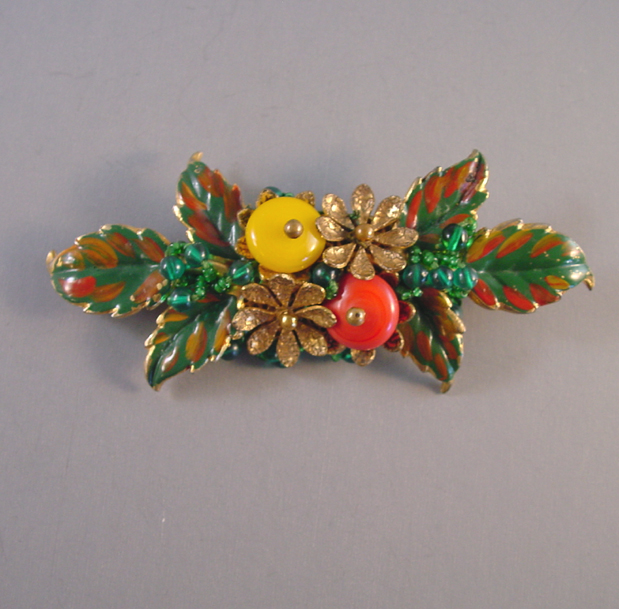 HASKELL Hess painted leaves and glass beads bar brooch circa 1935, 4″. This extra wide brooch is a lovely blend of colors, and the addition of the painted leaves to the glass beads and gold tone flowers make for a lovely pin. It is a Frank Hess design for Miriam Haskell, circa 1930s, and it is … Continue reading “HASKELL Hess painted leaves and glass beads bar brooch circa 1935”