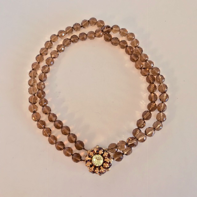 MIRIAM HASKELL tan faceted glass beads 2-strand necklace with yellow and brown rhinestone decorated clasp and gold tone leaves. This is a choker size 14″ necklace, fitting close to the throat, and it is signed on the back of the clasp “Miriam Haskell”. View View #H40529 $88.00
