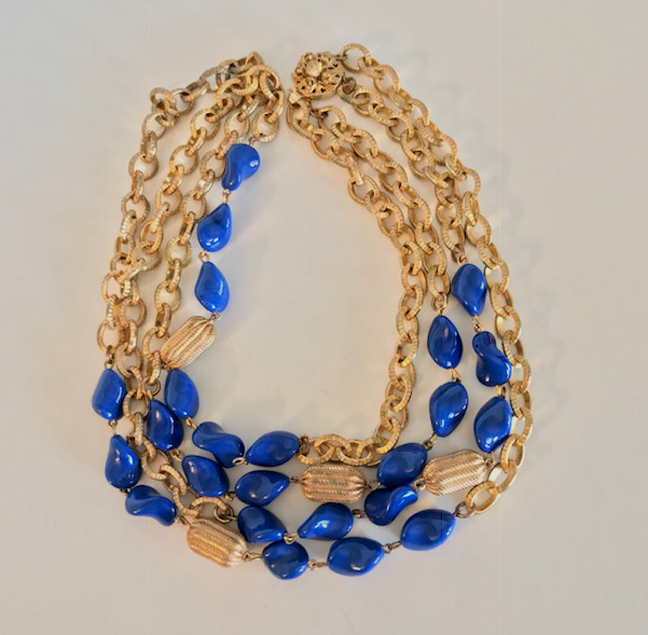 MIRIAM HASKELL long two strand necklace of lapis colored blue glass beads and wonderful textured gold tone chains, 28-1/2″ long and with a 5/8″ clasp decorated with gold cut steel seed beads. View #H40532 $98.00
