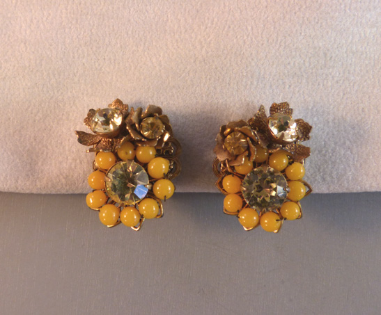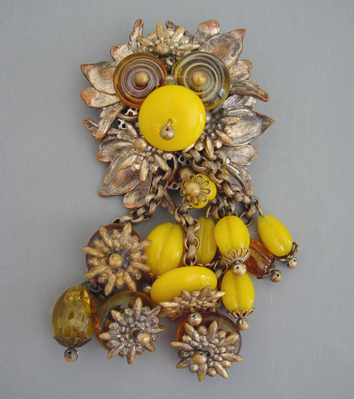 HASKELL Hess yellow and amber swirl glass flattened beads and dangles fur clip with silver tone leaves and flowers, 4″. A Frank Hess for Miriam Haskell, it is unsigned as was typical for this era, circa 1940. The bracelet to this set can be seen in Gordon & Pamfiloff’s “Miriam Haskell Jewelry” on page 134. View … Continue reading “HASKELL Hess yellow and amber swirl fur clip”