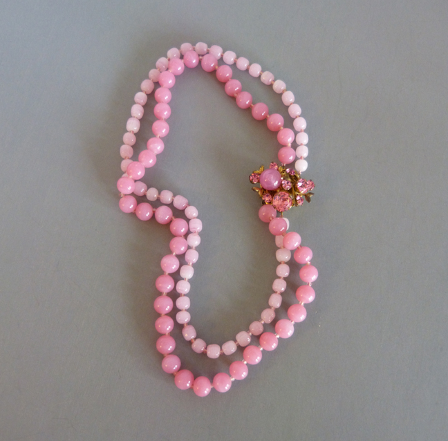 MIRIAM HASKELL pink glass beads two-strand necklace with a pink cabochons and rhinestones catch, 16" wearable length and in excellent vintage condition, circa 1950. View View #H38552 $120.00