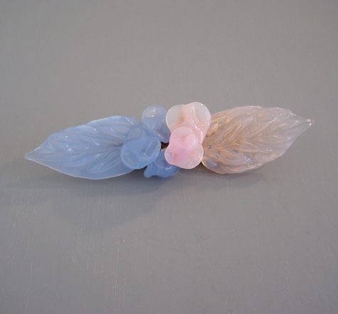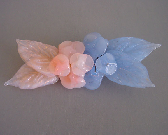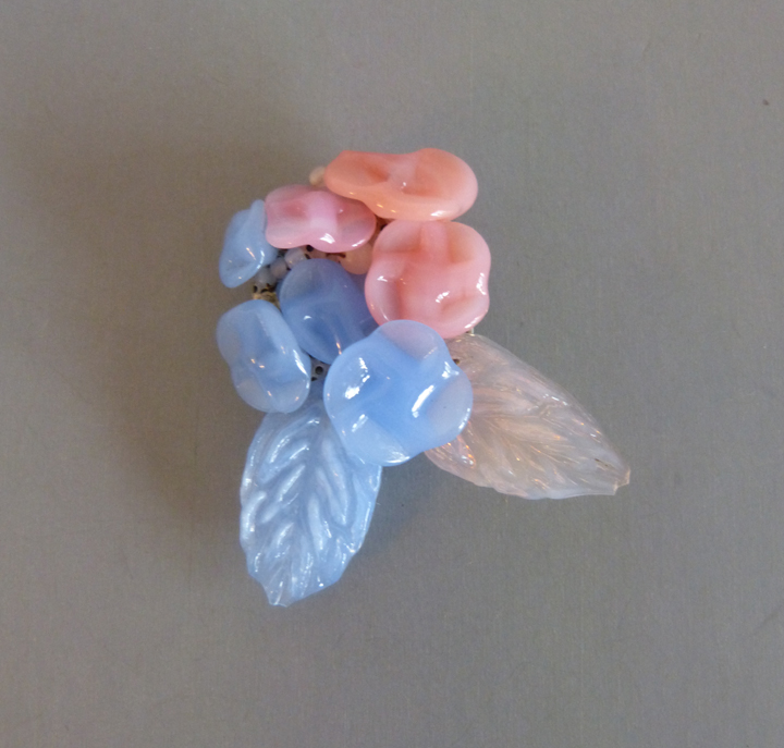 HASKELL Hess brooch of delicate pastel blue and pink glass leaves and buds wired onto the silver tone covered base, circa 1940, 3-1/2″ by 1-1/2″. Another piece from this group can be seen in Gordon & Pamfiloff’s “Miriam Haskell Jewelry” on page 123. This is in excellent condition and a beautiful piece. View View #H34222 $238.00