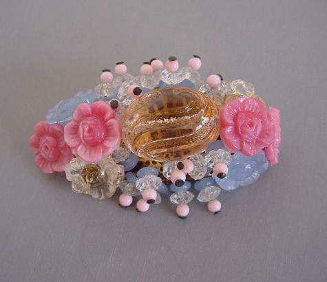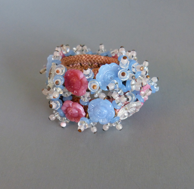 MIRIAM HASKELL Hess coil bracelet of pink, blue and clear glass beads and flowers, circa 1940. The bracelet is made up of pate de verre glass, glass beads, flowers and seed beads, just lush and gorgeous and all done by hand. The base is a woven cloth-covered heavy wire coil so it wraps around the wrist and … Continue reading “MIRIAM HASKELL Hess coil bracelet of pink, blue and clear glass”