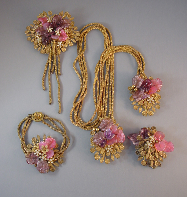 HASKELL Hess parure of pink and purple glass petals set in gold tone with clear rhinestone accents. This set took a long time to collect, and it is just a lovely example of the very best of Miriam Haskell and Frank Hess from the 1930s and 1940s. The pink and purple glass petals are accented with clear rhinestones … Continue reading “HASKELL Hess parure of pink and purple glass petals”