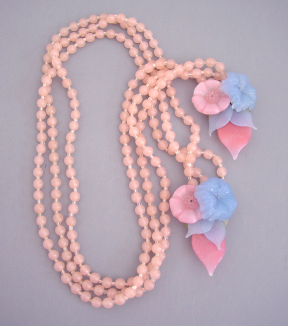 HASKELL Hess pink and blue glass flowers, leaves and beads lariat necklace, 26″ total length and clips 2-1/3″ each. A Frank Hess design for Miriam Haskell, it is unsigned as was typical for this era, circa 1930-1940, and it is in very good condition, ready to wear. Another piece from this group can be seen … Continue reading “HASKELL Hess pink and blue glass flowers, leaves lariat necklace”