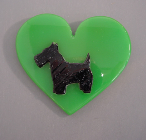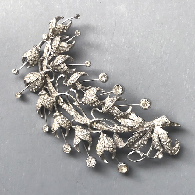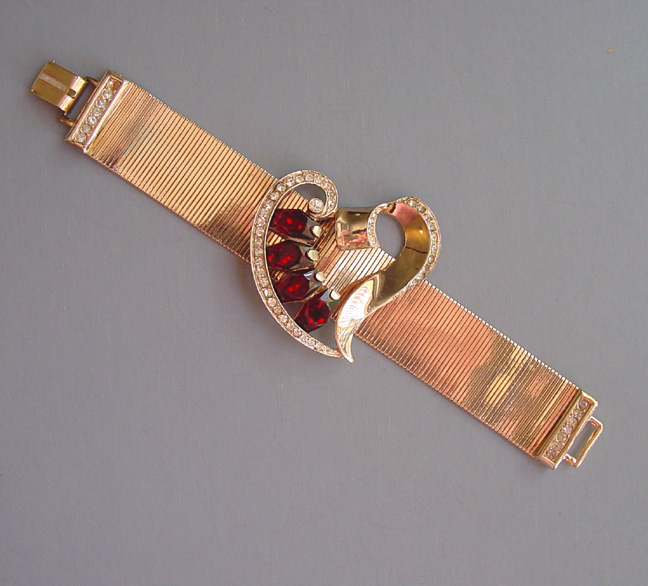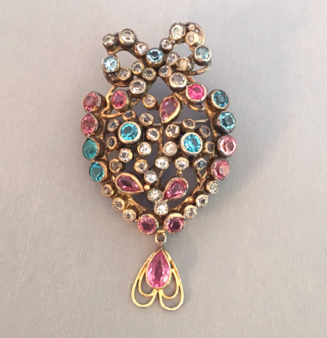 DEROSA fur clip with a heart suspended within a heart of clear rhinestones with a red enameled ribbon bow at the top. There is some missing red enamel on the bow and some very slight graying rhinestones, no surprise because this is probably one of the oldest DeRosa pieces we have ever had. I would … Continue reading “DEROSA fur clip with a heart suspended within a heart of clear rhinestones with a red enameled ribbon bow”