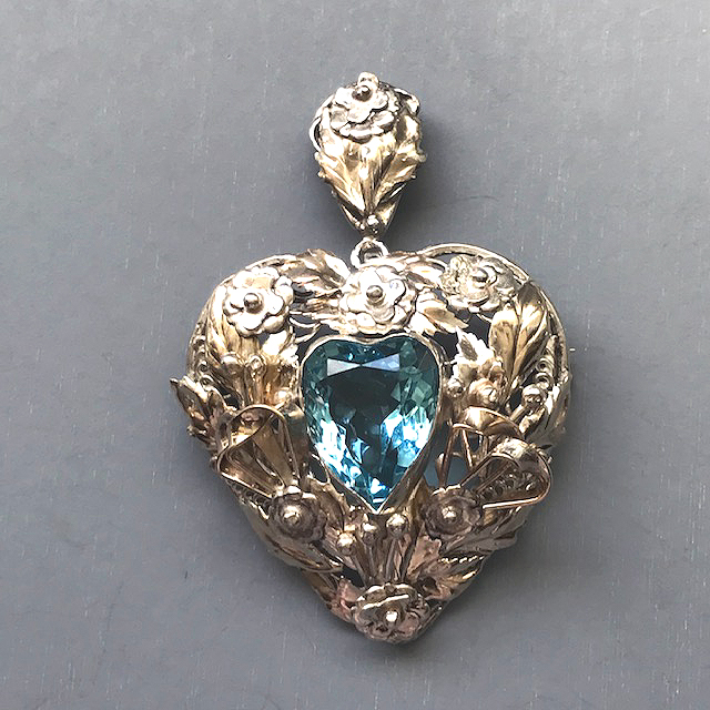 VICTORIAN gold filled heart charm with three aqua glass beads and etched designs on the front, 3/4″ by 3/4″. The aqua beads might be turquoise, but they are too small to tell for sure. This is a charm rather than a locket and it doesn’t open. Wouldn’t a whole bracelet of charms with turquoises be … Continue reading “VICTORIAN gold filled heart charm with three aqua glass beads and etched designs on the front”