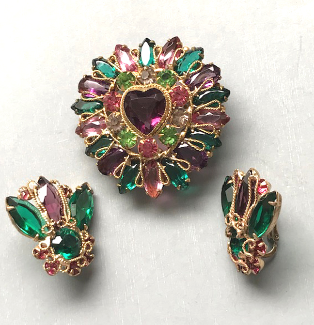 LARRY VRBA heart and flowers brooch with the dramatic size and wonderful creativity that makes his jewelry so special. The golden metal heart is surrounded with clear rhinestones and decorated by flowers made of poured glass, glass, mother-of-pearl, plastic in red, aqua and green. The aqua glass petals look like those used by Trifari years … Continue reading “LARRY VRBA heart and flowers brooch with the dramatic size and wonderful creativity that makes his jewelry so special”