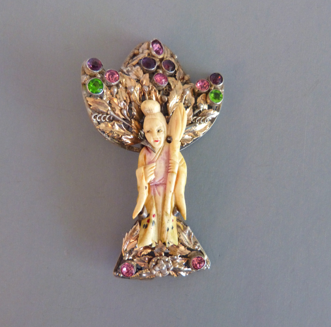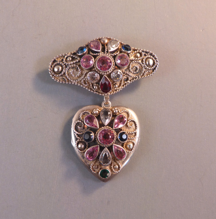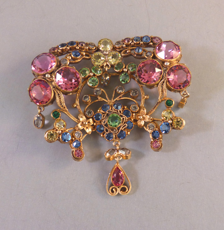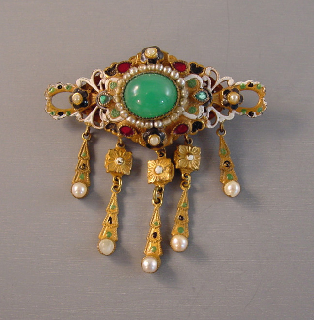 HOBE brooch with green glass cabochon, artificial pearls and enameling in red, white and black. It has 5 dangles and it’s all set in matte gold tone, 2-1/4″ by 2-1/4″, and has some slight wear on two pearls. This is one of the pieces Hobe did in the Austro-Hungarian Revival style circa 1960. Look at all the wonderful … Continue reading “HOBE brooch green & enamel, Austro-Hungarian Revival”