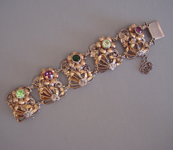 HOBE sterling bracelet with colored rhinestones, hand made flowers, florets, scrolls and bows. It is circa 1940-1945, and it is 6-1/3″ by 1-1/3″. The rhinestones are unfoiled to let light through, and they are purple, pastel green, and dark green. The hand worked sterling is masterfully done, a joy to own and wear, and it is in … Continue reading “HOBE sterling bracelet colored rhinestones, hand made flowers”