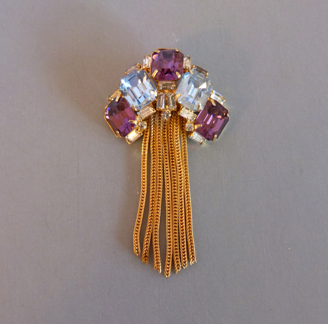 HOBE crescent brooch and earrings with unfoiled clear, purple and blue rhinestones set in gilt silver hand fashioned wire work. On the back of the 1-1/4″ brooch only is signed ”Hobe” on the typical rectangular applied plaque. Included are the matching earrings, which are 1-1/3″ clip backs, unsigned. One earring has an aqua rhinestone that is chipped at the tip, … Continue reading “HOBE crescent brooch, earrings with blue, clear, purple”