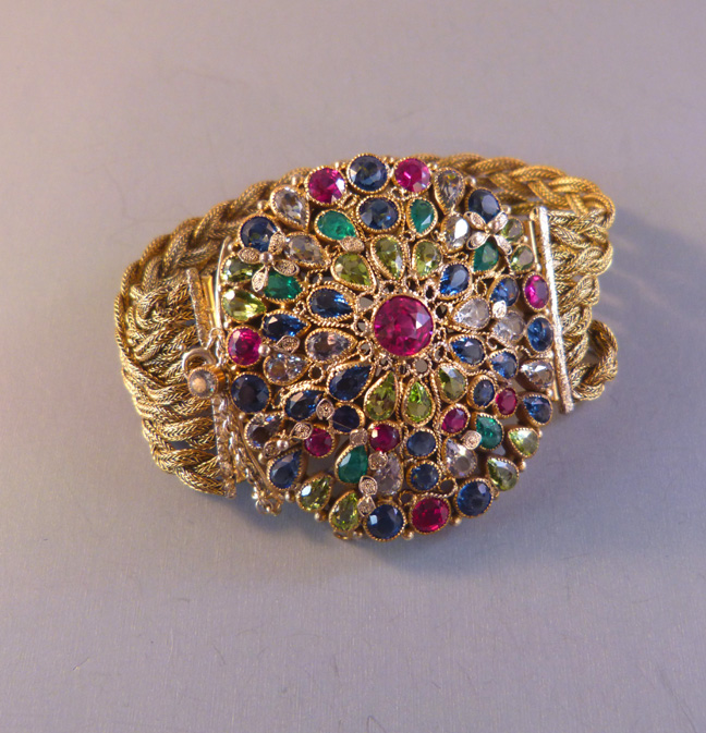 HOBE bracelet with a red synthetic ruby center, light yellow smaller peridot and colorful unfoiled rhinestones, all set in gold tone settings and chains. These rhinestones are some of the more unusual colors used in this era of Hobe. They include a deep rose, blue, green and yellow, and are all unfoiled. The chains are … Continue reading “HOBE bracelet red synthetic ruby center yellow peridot rhinestones”