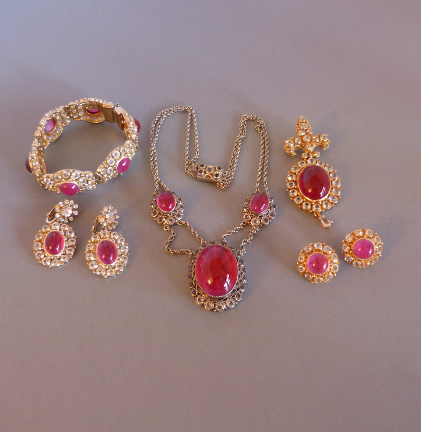 HOBE rose petal pink glass star burst cabochons and clear rhinestones parure with 5 pieces. This set includes a necklace, bracelet, brooch and two pairs of earrings, circa 1950’s. The necklace is 16-1/4″ with a center element of 1-5/8″ by 1-1/4″ and side elements of 1″ by 3/4″, and it has a rhinestone decorated box clasp. The … Continue reading “HOBE rose petal pink glass star burst cabochons and clear rhinestones grand parure”
