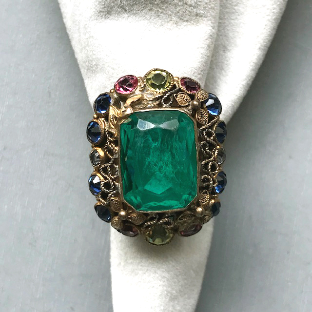 HOBE sterling silver ring with green, yellow and topaz color rhinestones with a tiny silver flower in the center, a beauty! Sadly, one green rhinestone has a sliver chip out of one side, visible under magnification, so it is priced accordingly. It is size 6 and runs 7/8″ along the finger. Hobe rings were not … Continue reading “HOBE sterling silver ring with green, yellow and topaz color rhinestones with a tiny flower in the center”