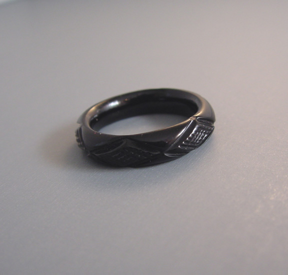 VICTORIAN jet cross hatch carved ring circa 1870, a larger ring at size 9, possibly a man’s ring, and 1/4″ wide. Jet is brittle and very difficult to carve so a ring like this would have been very challenging to make. It’s no wonder many of them didn’t survive until now. View #V37674 $238.00