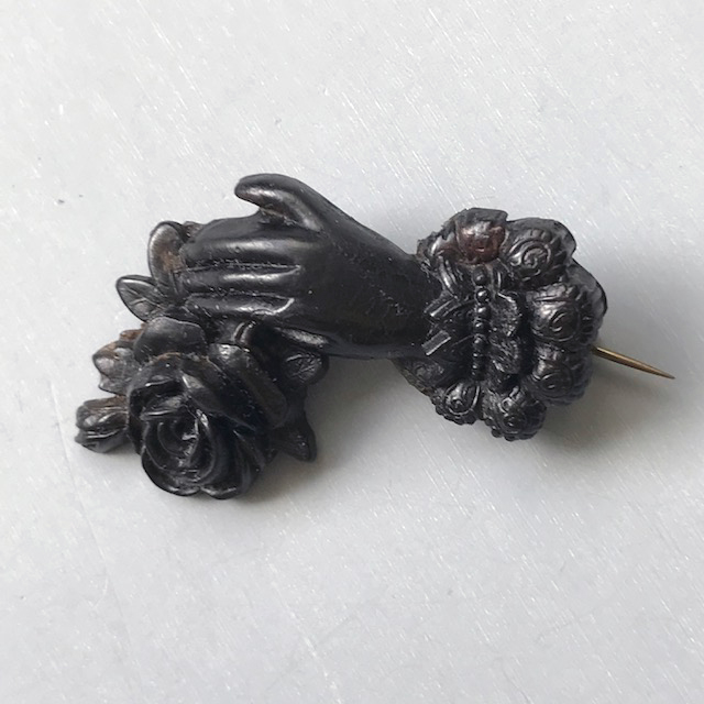 VICTORIAN French jet (black glass) insect or bug pin with flowers and leaves, 1-7/8″. This whimsical combination of dragonfly and lily-of-the-valley flowers is really unusual. French jet is faceted black glass backed with black enameled metal. It is usually more shiny and the pieces much more delicate thanWhitby jet. View #V35883 $198.00
