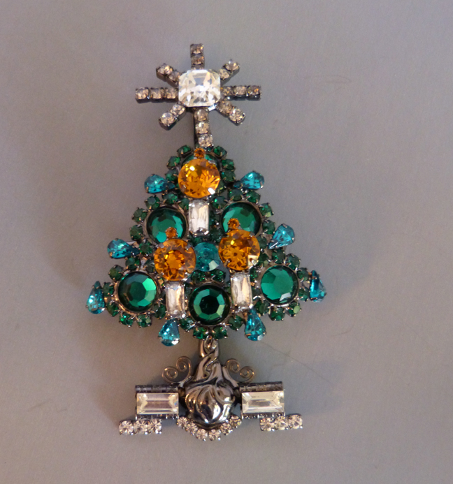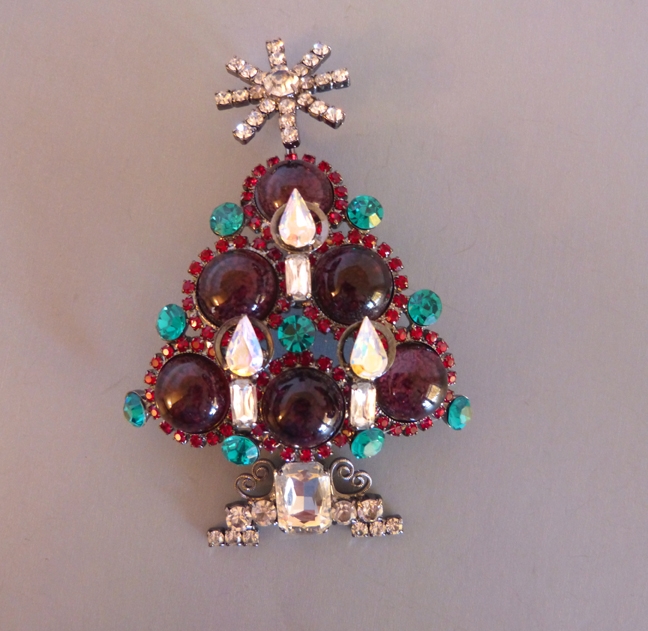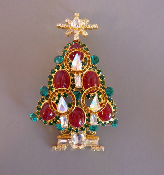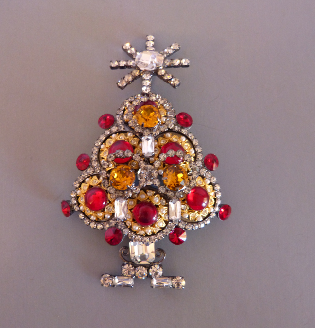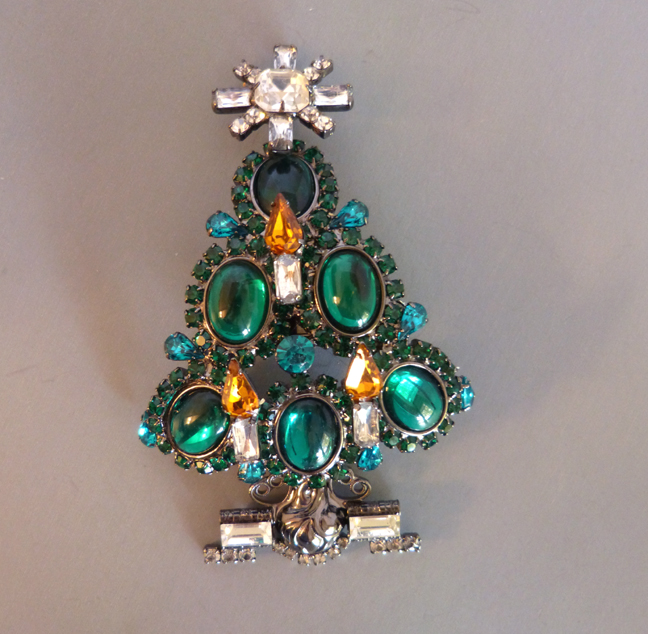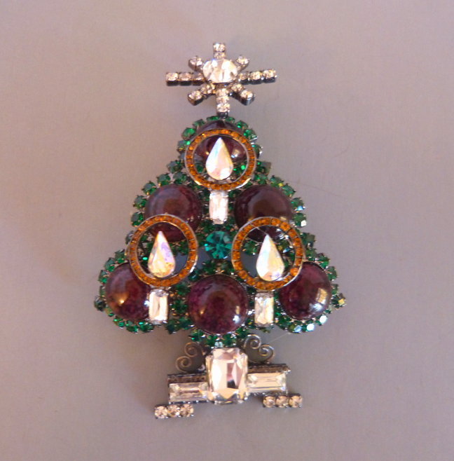 LARRY VRBA Christmas tree brooch in unusual pink rhinestones with clear and topaz colored candles with a pink rhinestone star atop. It is 4-1/4″ by 2-1/2″, a smaller size compared to many of his trees. Signed on the back “Lawrence Vrba”, he was kind enough to make this for me. View View #X42067 $250.00
