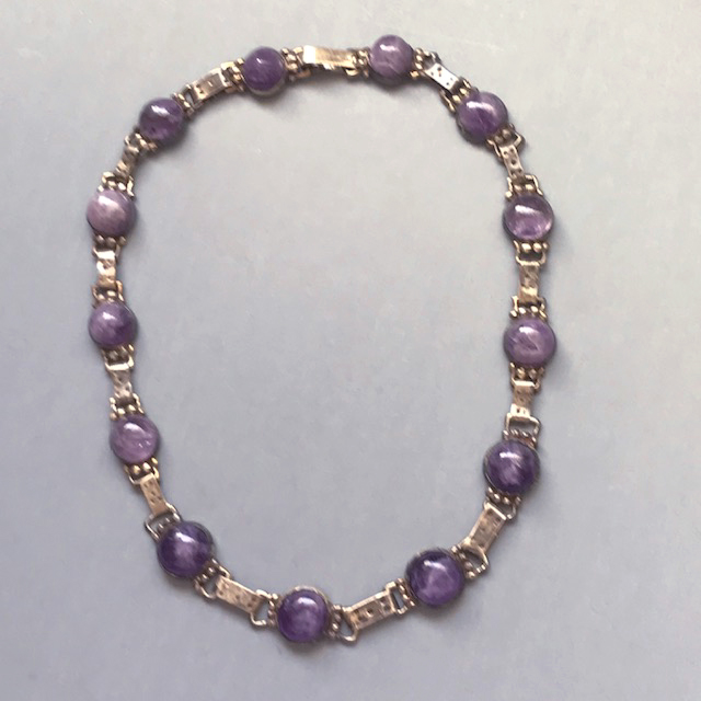 AUSTRO-HUNGARIAN genuine AMETHYST Renaissance inspired necklace with mother-of-pearl accents in a gold plated silver setting. The amethyst is said to promote peace and calmness, which we could certainly use in our world. It has the boar’s head hallmark on the clasp as well as the mark “<12″, the meaning of which we do not know. … Continue reading “AUSTRO-HUNGARIAN genuine AMETHYST Renaissance inspired necklace with mother-of-pearl accents in a gold plated silver setting”