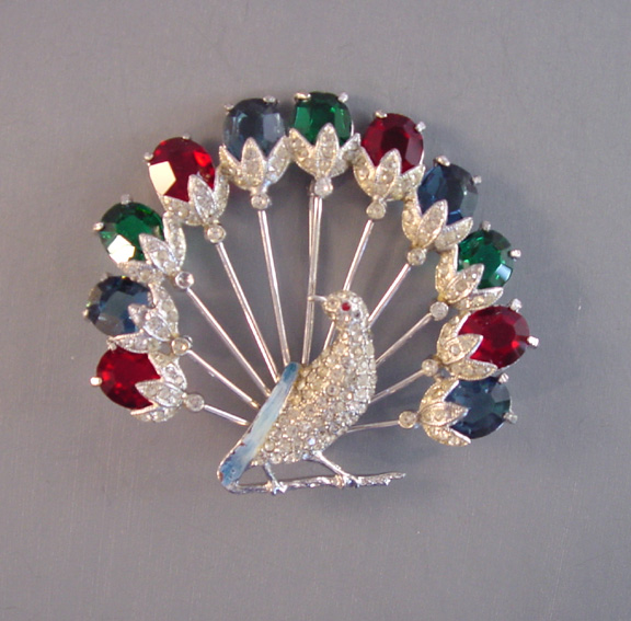 PEACOCK brooch with red, green and blue unfoiled rhinestone “eyes” and clear rhinestones and blue enameled tail, enamel as is with a bit missing but otherwise in very good vintage condition, circa 1940s, 3″ by 2-1/2″. View View #Y38669 $178.00